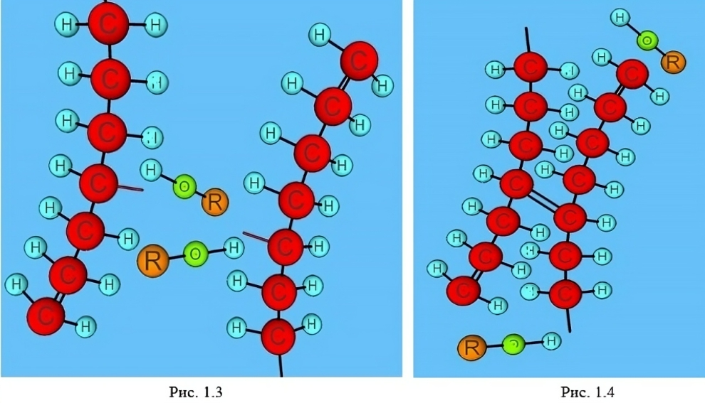 Радикалы пероксидов забирают у атомов полиэтилена по одному атому водорода, что приводит к образованию свободной связи у атома углерода (рис. 1.3). В соседних макромолекулах полиэтилена атомы углерода, имеющие свободные связи, объединяются (рис. 1.4).