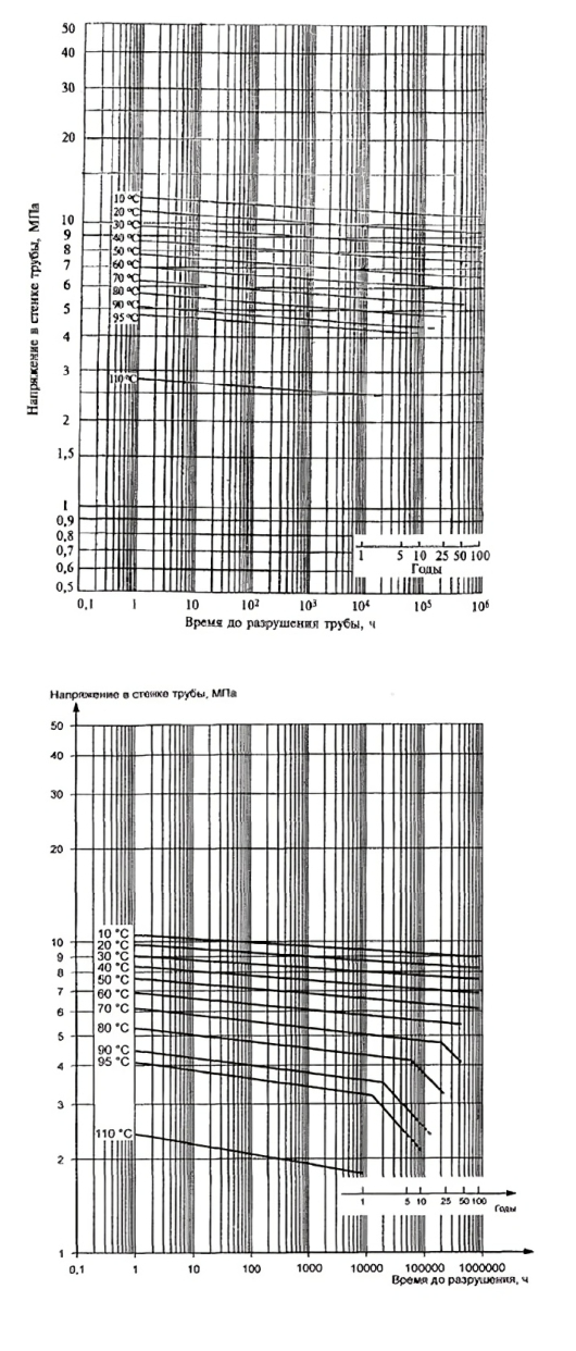 Рис. 7. Эталонные кривые длительной прочности труб из PEX (сверху) и PERT (снизу)