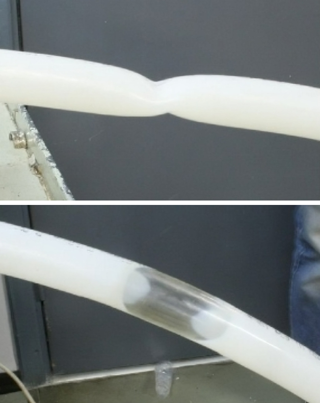 Рис. 6.3. Излом трубы из PEX-c без антидиффузионного слоя и ее восстановление после прогрева до 100 °С (неокрашенный сшитый полиэтилен при высоких температурах становиться прозрачным)