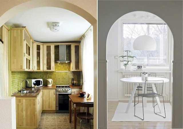 Компромиссом может стать замена стандартной распашной двери на модель другой конструкции. Это может быть компактно складывающаяся «гармошка», раздвижная перегородка или дверь из прозрачного стекла. Такая дверь не требует места для распахивания створки, в открытом состоянии она объединяет кухню с другим помещением, в закрытом – изолирует ее.