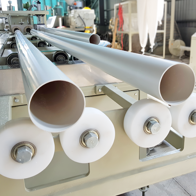 Затем изделие проходит через тянущий механизм, который регулирует скорость перемещения и натяжение трубы, обеспечивая стабильные размеры. После этого выполняется маркировка — на поверхность наносятся данные о производителе, диаметре, номере партии и дате выпуска. Когда труба полностью охлаждается до комнатной температуры, она отрезается на стандартные отрезки длиной 3–6 метров с помощью пилы или фрезерного устройства. В некоторых случаях выполняются дополнительные операции, например, ориентация молекулярной структуры для повышения прочности или формирование раструбов на концах для облегчения монтажа.