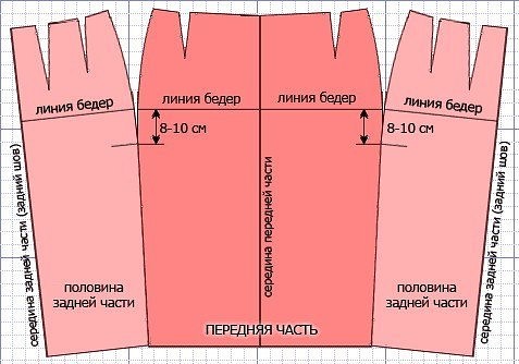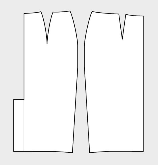 Выкройка юбки-карандаш без боковых швов В первом случае, учитывая разрез под шлицу, наша юбка-карандаш имела три шва – один задний и два боковых, но вполне можно обойтись и одним вертикальным задним швом. Швы по бокам будут, но только до отметки на 8-10 сантиметров ниже линии бедер. Аналогично первому варианту для построения выкройки данной юбки-карандаш за основу берем выкройку прямой двухшовной юбки. Построив бумажные выкройки задней и передней части юбки, аккуратно отрезаем части друг от друга и делаем дубликаты. При переносе выкройки на ткань складываем детали следующим образом:
