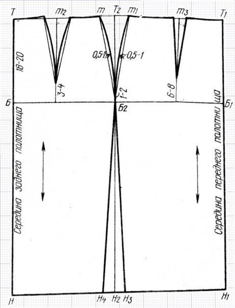 Не сложнее пошива обычной прямой юбки, тем более что выкройка юбки-карандаш строится именно на основе базовой выкройки прямой юбки. С легкой руки гениального Кристиана Диора в 40-х годах прошлого века юбка-карандаш появилась в гардеробе модниц, став такой же культовой вещью как туфли-лодочки и легендарное маленькое черное платье неподражаемой Коко. Сегодня этот универсальный фасон популярен как никогда, поэтому если в вашем гардеробе он пока отсутствует, самое время отправиться в бутик или ателье. А может попробуем обойтись собственными силами? Шаг первый: Выкройка прямой двухшовной юбки Чтобы построить выкройку классической юбки-карандаш, прежде всего, мы построим выкройку обычной прямой двухшовной юбки. Для этого нам понадобятся следующие мерки и метки: ПОт – мерка полоубхвата талии; ПОб – мерка полуобхвата бедер; Дс – длина юбки сзади; Дп – длина юбки спереди по средней линии; Дю – длина юбки от линии талии сбоку; Дст – длина спинки до линии талии. Не забудьте и о прибавках для свободного облегания: Пб (прибавка на линии бедер) =2 см; Пт (прибавка на линии талии) =1 см. Этапы построения выкройки двухшовной прямой юбки basic-skirt-487x637-custom (487x637, 53Kb) 1. Заднее полотнище Средняя линия В верхнем левом уголке листа ставим точку Т и проводим из нее прямую вертикальную линию. Линия низа юбки По средней линии от точки Т откладываем отрезок, который должен быть равен мерке Дс – длине юбки от талии сзади. Ставим точку Н: ТН=… см. Теперь от точки Н проводим горизонтальную линию вправо. Линия бедер От обозначенной нами точки Т откладываем по средней линии заднего полотнища отрезок, который равен 1/2 мерки Дст – длине спины до линии талии минус один сантиметр. Ставим точку Б. Таким образом ТБ = Дст/2 –1 см= … см. При построении выкроек, как правило, расстояние до бедер от линии талии для всех размеров принимают равным 8-20 сантиметрам. От точки Б проводим горизонтальную линию вправо. 2. Переднее полотнище Линия середины ББ1 = ПОб Пб = … см. От обозначенной точки Б откладываем по линии бедер отрезок, который ровняется мерке полуобхвата бедер вместе с прибавкой для свободного облегания. Ставим точку Б1. А теперь через точку Б1 проводим вертикальную линию, обозначив пересечение с линией низа буквой Н1. Вверх по вертикали от точки Н1 откладываем равный мерке длины переда отрезок и ставим точку Т1. Линия боковых срезов ББ2 = (ПОб Пб)/2 –1 см= … см. От обозначенной точки Б откладываем по линии бедер отрезок, который ровняется половине мерки ПОб – полуобхвату бедер и прибавки для свободного облегания минус1 сантиметр. Ставим точку Б2. Теперь из точки Б2 проводим вертикальную линию, обозначив пересечение с линией низа точкой Н2. Вверх от точки Н2 откладываем длину юбки и ставим точку Т2. 3. Заднее и переднее полотнища Соединив по линейке линии Т, Т2 и Т1 получаем линию талии. 4. Вытачки На выкройке классической двухшовной юбки обычно делают три вытачки. При этом сумма растворов всех вытачек на юбке ΣВ равняется разности ширины юбки по линии талии и ширины по линии бедер: ΣВ = (ПОб Пб) – (НОт Пт) = … см. Боковая вытачка тТ2 = т1Т2 = 1/2*ΣВ/2 = … см. Раствор боковой вытачки равняется половине ΣВ. Влево и вправо от точки Т2 откладываем по половине раствора и ставим точки т и т1, соединив их с точкой Б2. Делим полученные отрезки пополам и внутрь вытачки из точек деления ставим перпендикуляры, и о