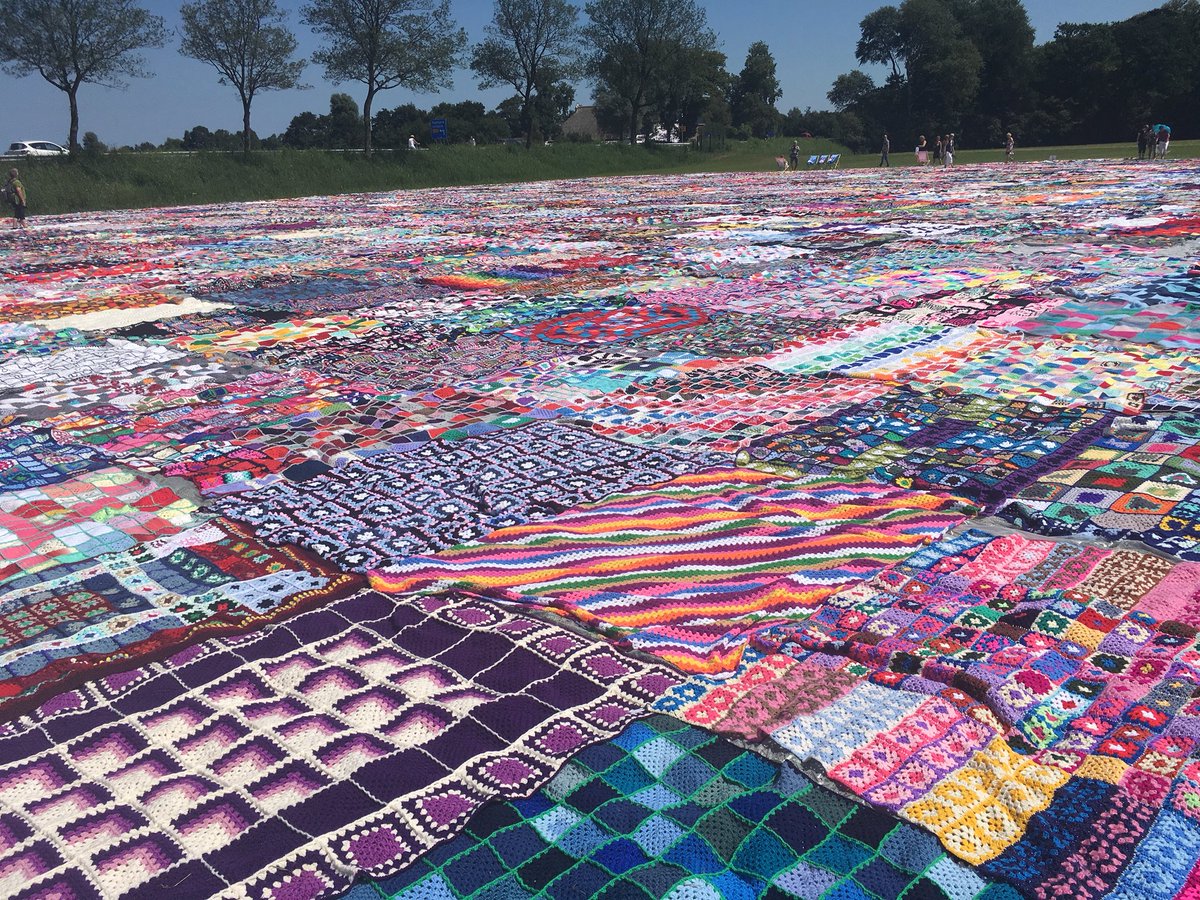 Несколькими рукодельницами была организована акция, которая предложила женщинам из разных стран соткать огромное покрывало! Чем они их мотивировали я точно не знаю, но акция получила отклик и им присылались вязанные изделия из 50 разных стран, их нужно было только соединить вместе.