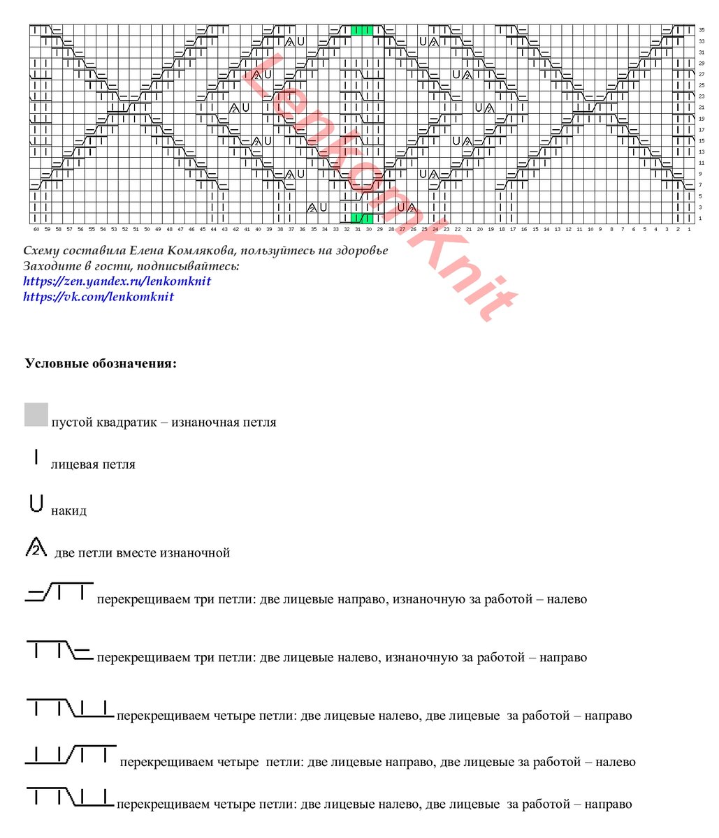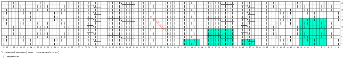 На схеме - узор для этого свитера (сколько влезло на 99 петель). По краям от центрального узора вяжутся ромбы из лицевых и изнаночных петель на нужную ширину изделия (раппорт выделен зеленым цветом).
