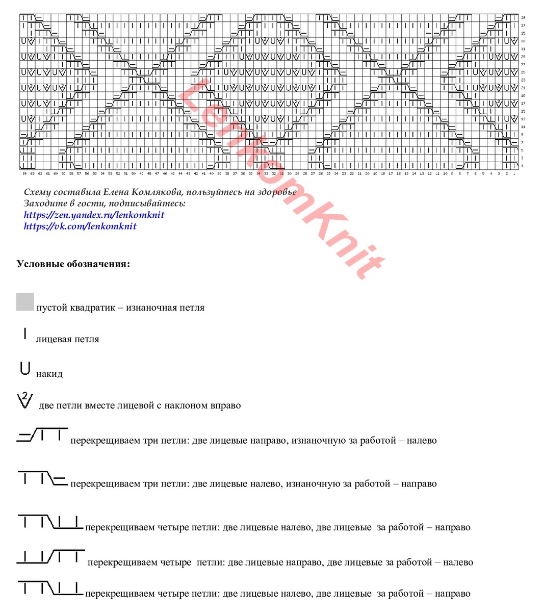 На рисунке - схема узора. Тут я тоже сделала ромбы на меньшем количестве петель, чем в оригинале. Чтобы при ручном вязании они получились по размеру такие же, как на фото. Раппорт узора - с 10 по 51 петли, в высоту - 36 рядов.