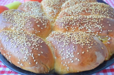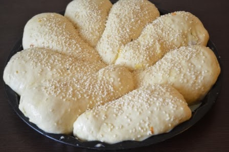 Смазать кисточкой желтком с молоком, посыпать кунжутом и отправить в духовку на 1 час при 180 гр. Я выпекала на середине духовки. Если начнет сильно румяниться - прикрыть фольгой в 2 слоя. [400x265]