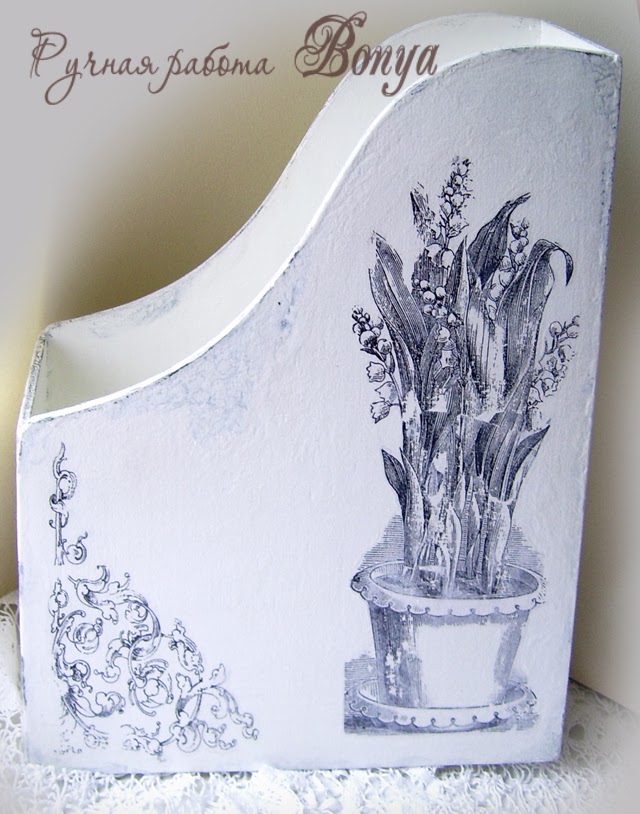 Как говорится, Остапа понесло! У меня опять декупаж, на сей раз газетница. Думала, что делаю ее для прихожей, но так удобно хранить в ней обрезки бумаги, когда работаешь, что это творение заняло почетное место на моем рабочем столе.