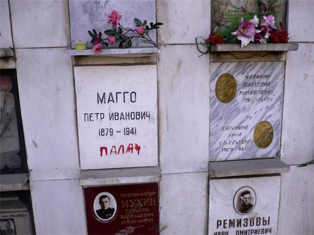 (Магго похоронен на Новодевичьем кладбище; время от времени кто-то наносит на его гробницу надпись «палач»)