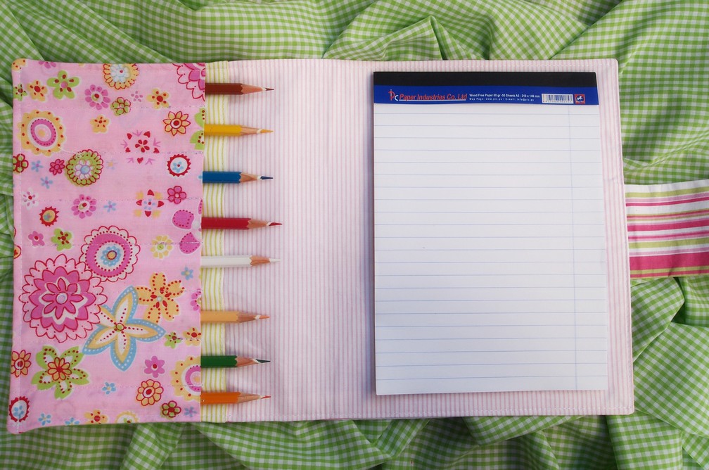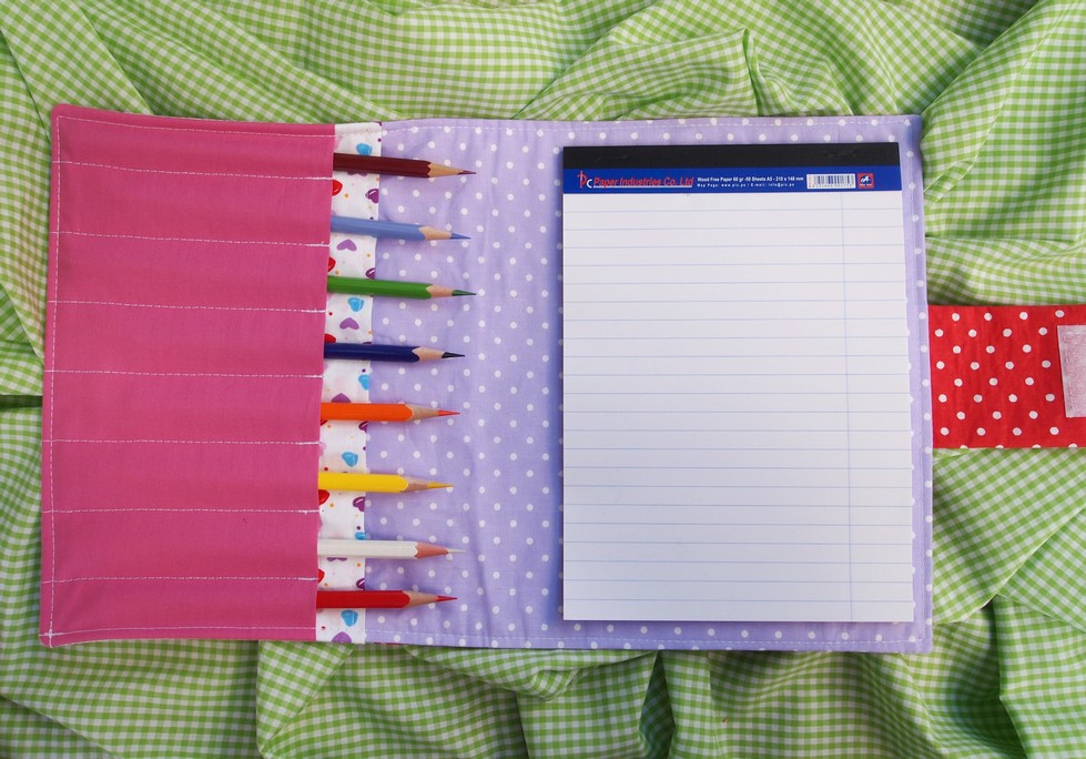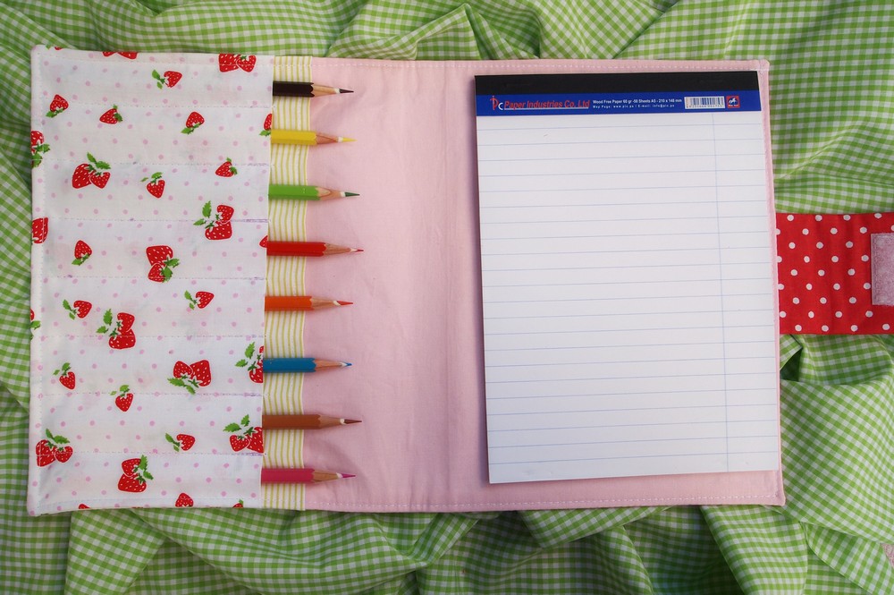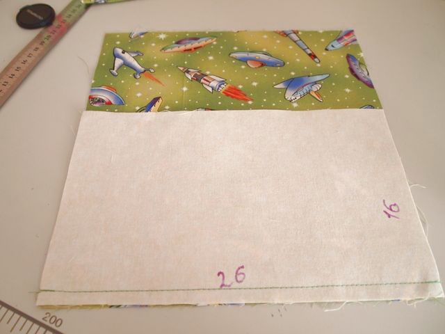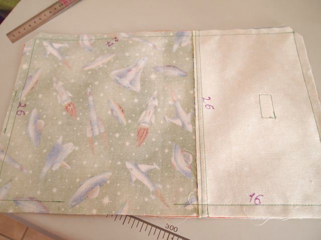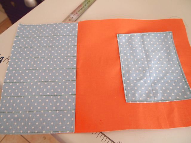 Внутренняя часть.Загибаем карман для карандашей пополам на изнаночную сторону (лицом наружу),делаем разметку,как показано на фото и пристрачиваем к основной внутренней части.Карман для блокнота загибаем пополам на лицевую сторону,прострачиваем по периметру,оставляя место для выворачивания,выворачиваем,застрачиваем ...ммм...дырку (я ее как правило оставляю сверху) и пристрачиваем к основной части.