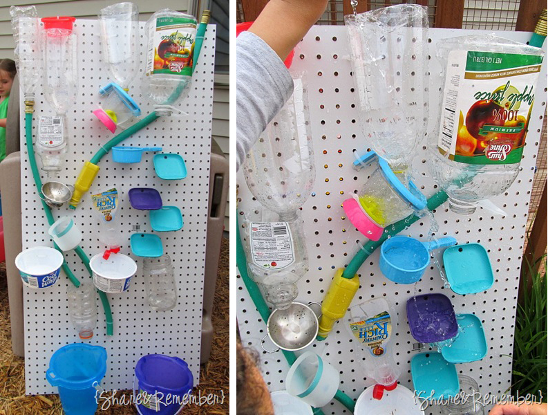 При помощи всевозможных ёмкостей и шлангов сооружается стена, по которой можно будет пустить воду, чтобы она проходила через все препятствия.