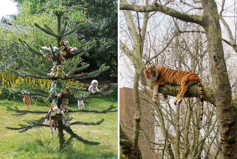 На любой даче или в деревне можно устроить настоящие джунгли. На ветки яблонь, слив и вишен можно посадить мягкие игрушки тигров, пантер , обезьян, а в кустах смородины могут пастись зебры и жирафы.