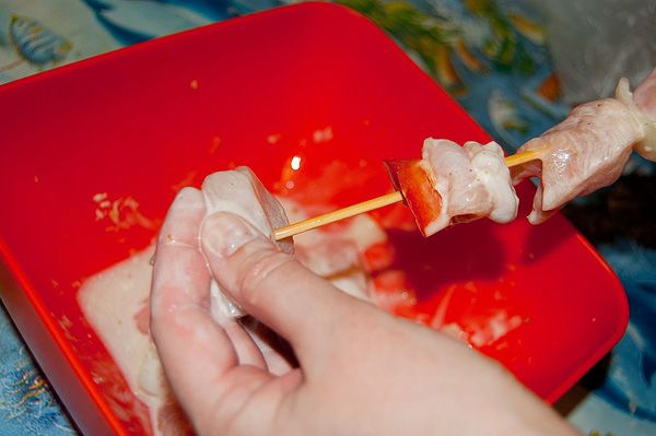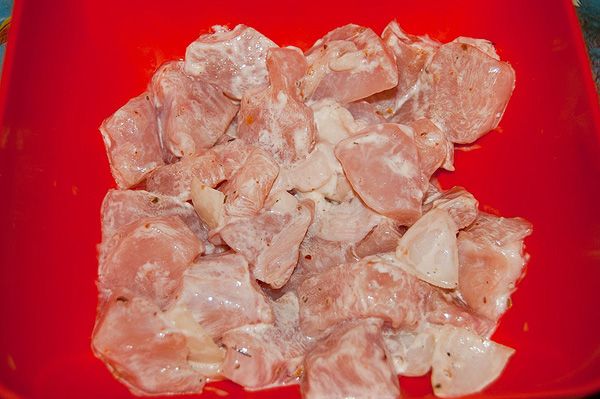 Куриное филе вымыть, нарезать кубиками. Посолить, поперчить, посыпать приправой и оставить на 1 час мариноваться. А в это время замочить шпажки в воде. Перец очистить от семян, лук почистить, нарезать квадратиками.