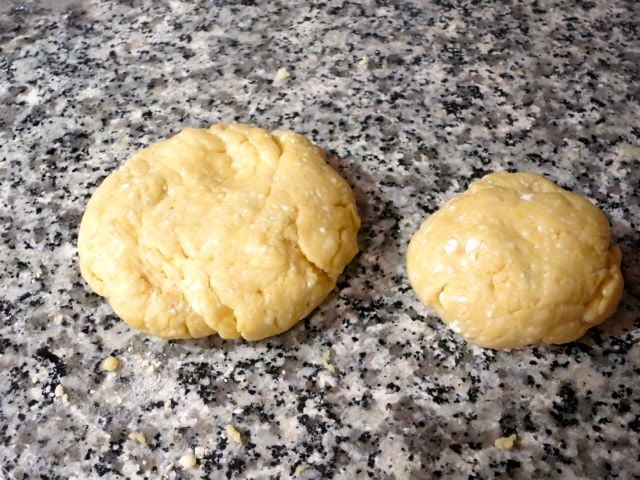 Добавляем муку и замешиваем довольно крутое, но не очень жесткое тесто. Разделяем тесто на две части (одна из них должна быть примерно на треть больше другой.)
