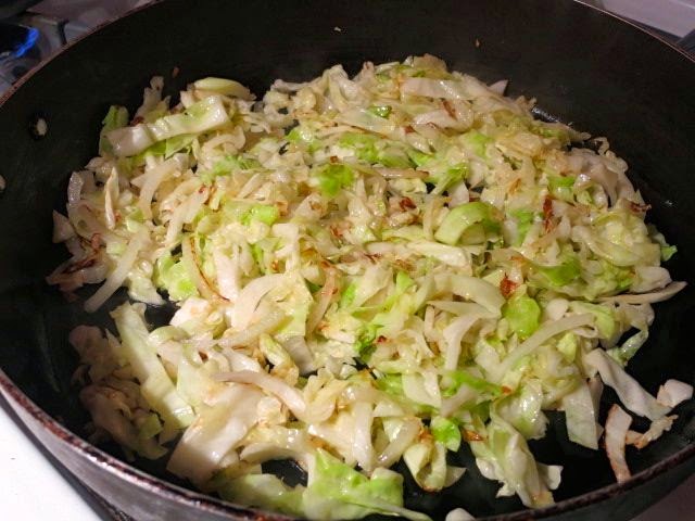 В сотейнике разогреваем растительное масло. На средне-большом огне готовим капусту и лук со щепоткой соли, часто помешивая, минут 7, до мягкости. Долго готовить капусту для этого пирога не нужно. Остужаем капусту.