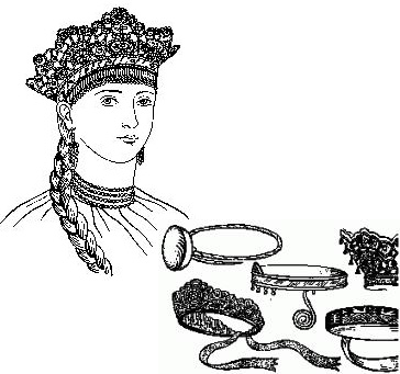 Вспомним классика: «А во лбу – звезда горит». Славянские девушки носили матерчатые тесемки на лбу, а позже – девичий венец «увясло». Другой типично славянской разновидностью «красы» был венчик из тонкой (около 1 мм) металлической ленты. Мастера-кузнецы украшали венчики орнаментом и придавали им разную форму, в том числе с расширением на лбу, как у византийских диадем.