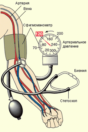 Давление крови измеряется сфигмоманометром. Прибор надевают на руку; давление в нём увеличивают примерно до 200 миллиметров ртутного столба. Затем из сфигмоманометра медленно выпускают воздух, непрерывно прослушивая пульс. Таким образом последовательно находят сначала артериальное давление, а затем венозное
