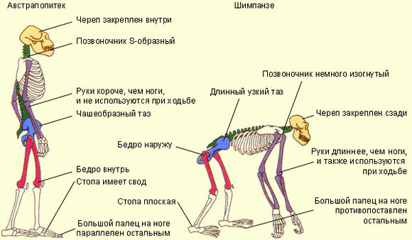 Скелеты шимпанзе и австралопитека