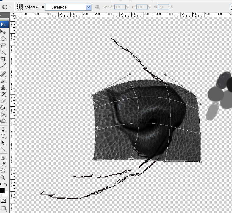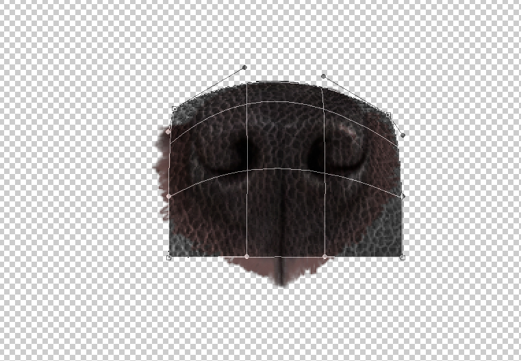 В принципе, на этом этапе можно и остановиться, но можно пойти и дальше и дать носу текстуру кожи. У собак она чешуистая, похожая на сеточку. Берем текстуру, переводим слой в режим Перекрытие (Оverlay) прозрачность (Opacity) 50%, обесцвечиваем ее (Shift+Ctrl+U), трансформируем (Ctrl+Т) и деформируем под объем носа собаки.