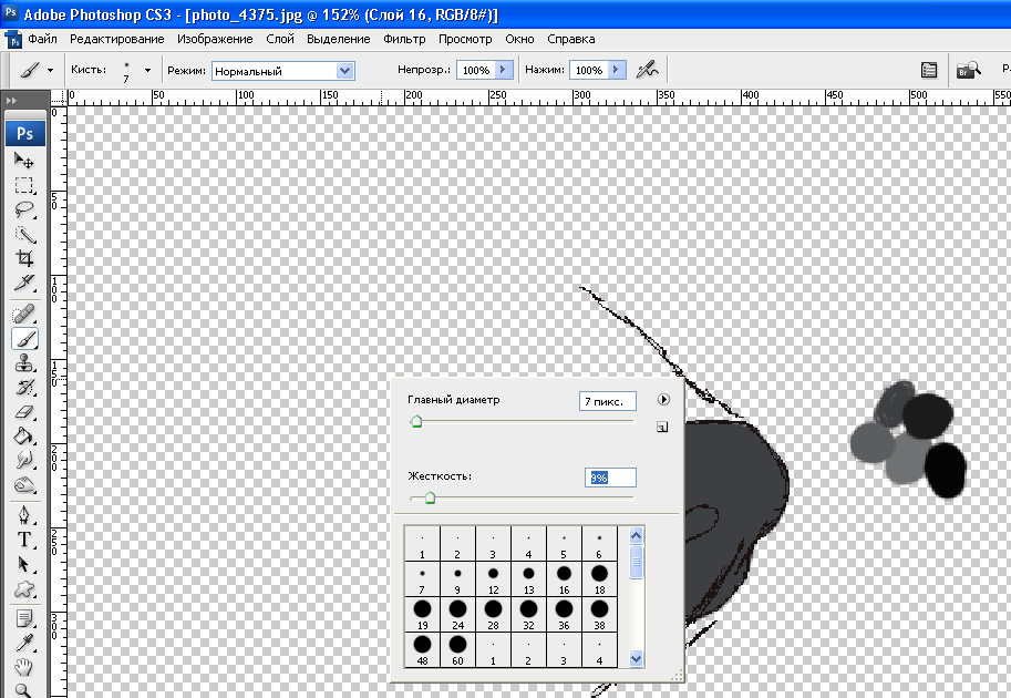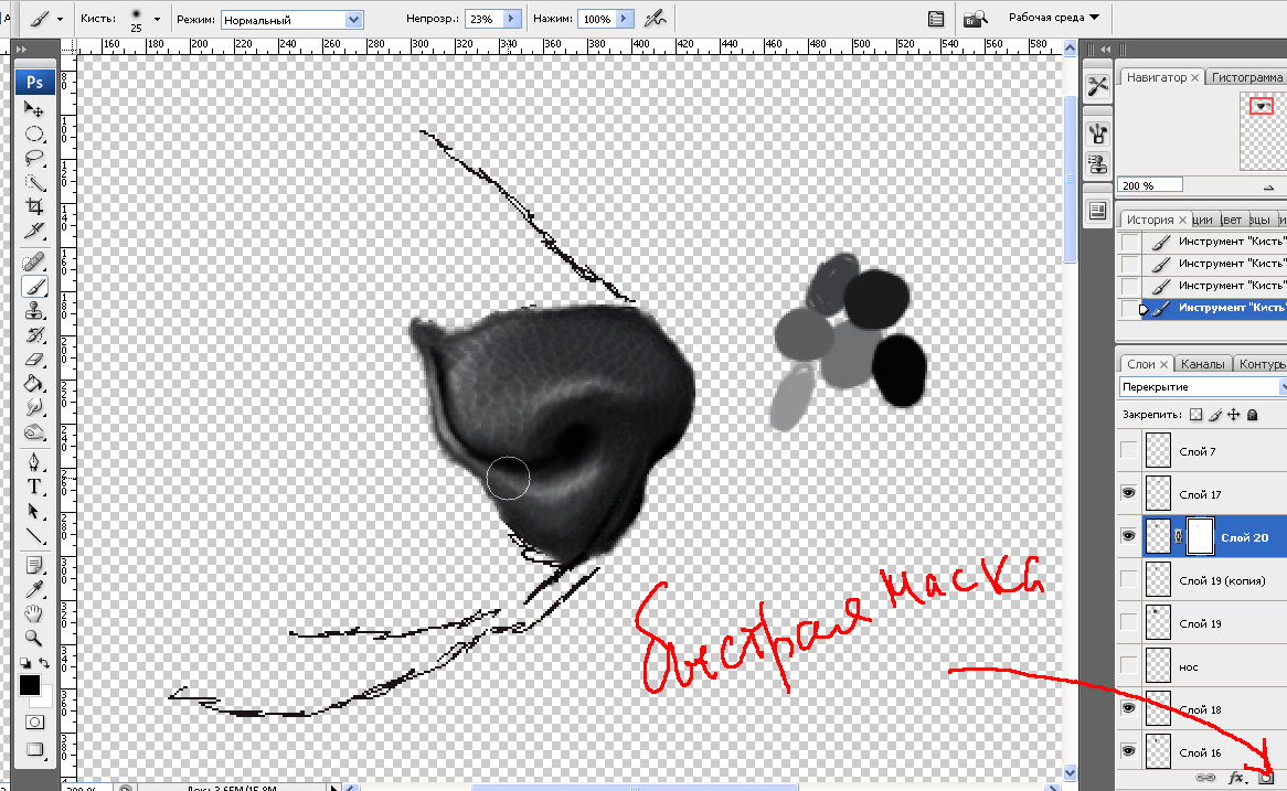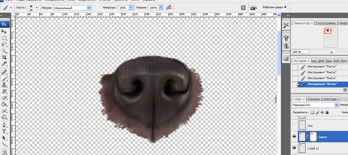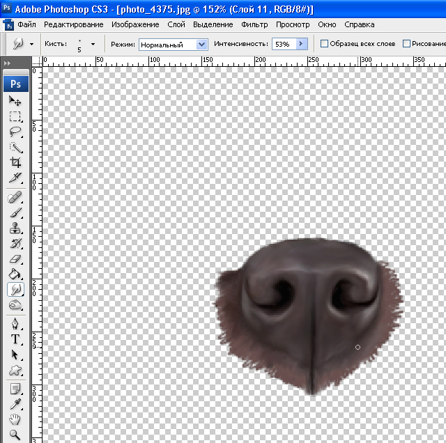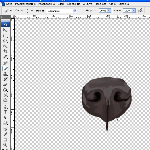 Обрезаем все лишнее, одеваем на слой "Быструю маску", берем мягкую кисть, ее прозрачность (Opacity) 23% и убираем лишнюю текстуру, т.к. наиболее ярко текстура лежит на спинке носа и переднем "зеркале" носа. На ноздрях снизу ее почти нет.