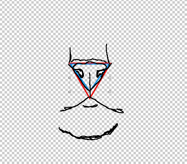 Итак, два треугольника.Красный- в него вписывается сам носик кошки вместе с продольной складкой до верхней губы. Синий-он чуть шире в верхней части и по его верхним углам располагаются крылья ноздрей.