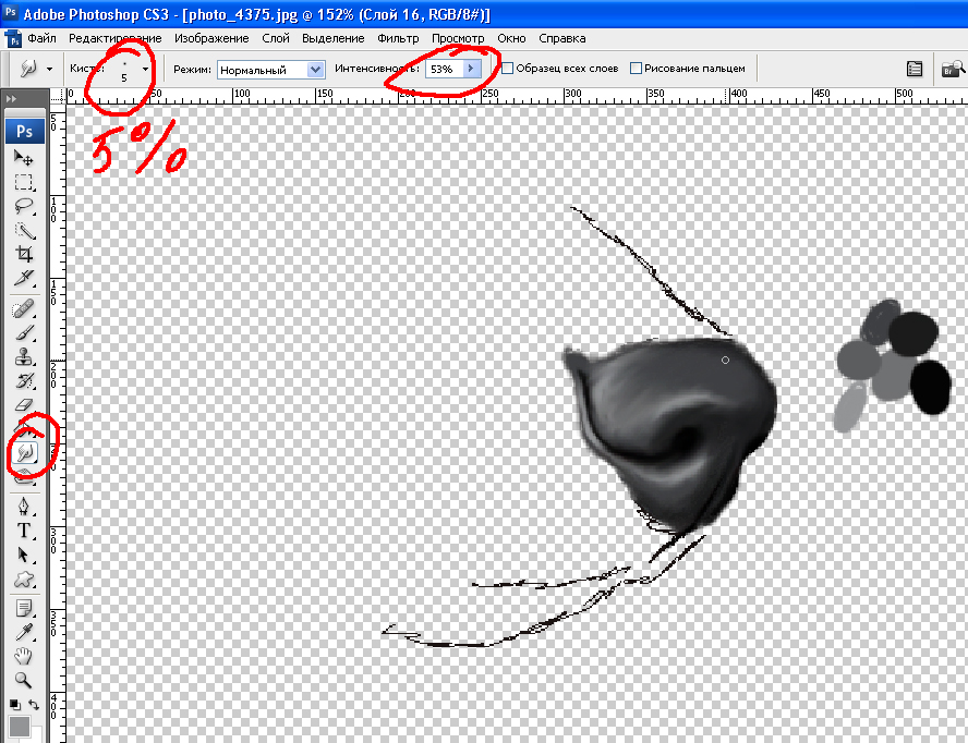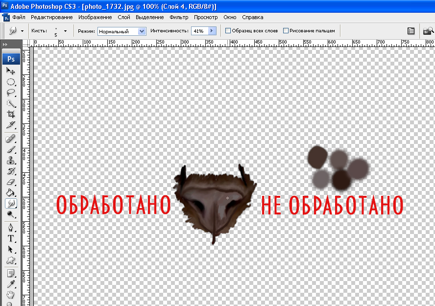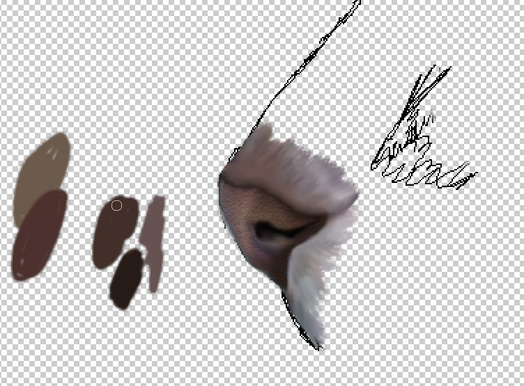 Техология прорисовки аналогична как мы рисовали нос собаки. На срине показан нос до и после обработки его инструментом "Палец" (Smudge).