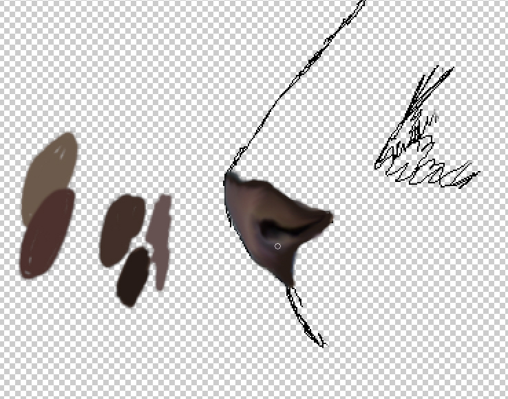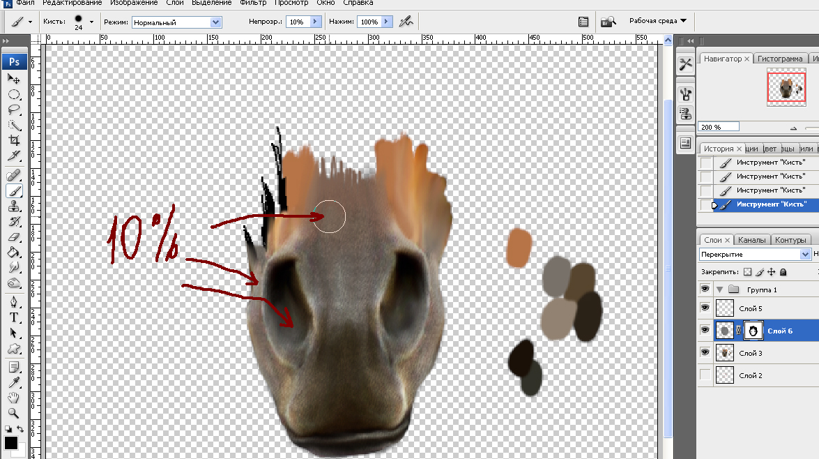 Над слоем с фоном, мягкой круглой кистью наносим цвета, затемняем носовые отверстия, при том, что чисто черный цвет там только в глубине, в середине, остальные темные переходы, это смешение черного и фонового цвета.