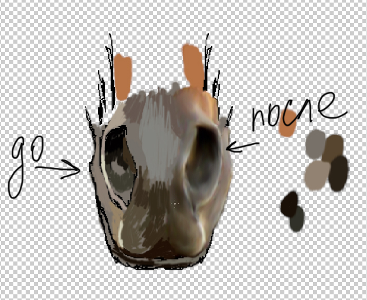 Опять наносим фоновый цвет и сверху колор. Инструментом"Палец" (Smudge), при интенсивности от 20-55% мягко растираем наши резкие линии, придавая носику объемы.