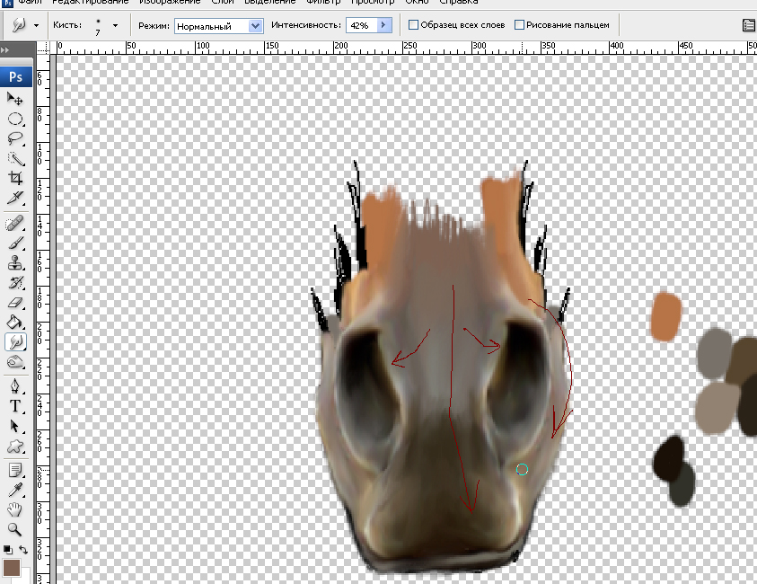 Опять инструментом "Палец" (Smudge), при интенсивности от 20-55% мягко растираем наши резкие линии, стараясь ложить мазки сообразно тем самым красным стрелочкам.