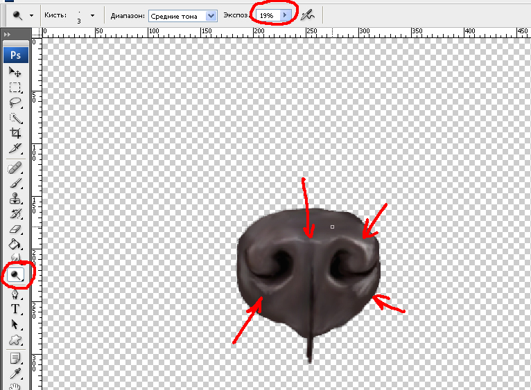 Акцентируем блики инструментом "Осветлитель"(Dodge). Нос почти всегда влажен. В жару блики будут ярче и интенсивнее, в холод малозаметны.