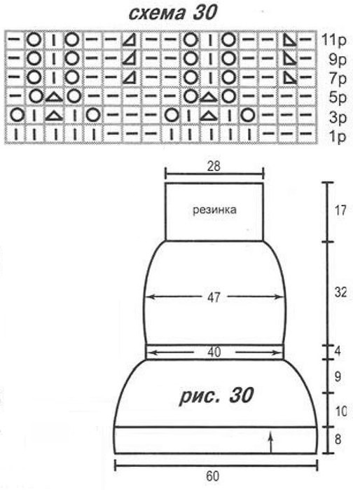 Наберите на спицы расчетное число петель и вяжите по кругу, чередуя узоры в следующем ритме: 8 см резинка 2 x 2, 10 см *4 р.: ЛП, 5 р.: ИП*, 9 см «косы»: 8 ЛП, 4 ИП, в 10-м ряду перехлест, затем при переходе на резинку 2 х 2 провяжите все петли по 2 и свяжите 4 см; следующие 32 см полотна вяжите так: узор «шахматка»: 4 ЛП, 4ИП 4 ряда, затем сместите узор в шахматном порядке и провяжите еще 4 ряда, повторите 3 раза, затем 5 р. изнаночная гладь, 4 р. лицевая гладь, 5 р. изнаночная гладь, затем ажурный узор по схеме 30, 8 р. резинка 2 x 2, платочная вязка 4 р., в 24 р. резинка 2 x 2, затем резинка 1 x 1. Петли свободно закройте.