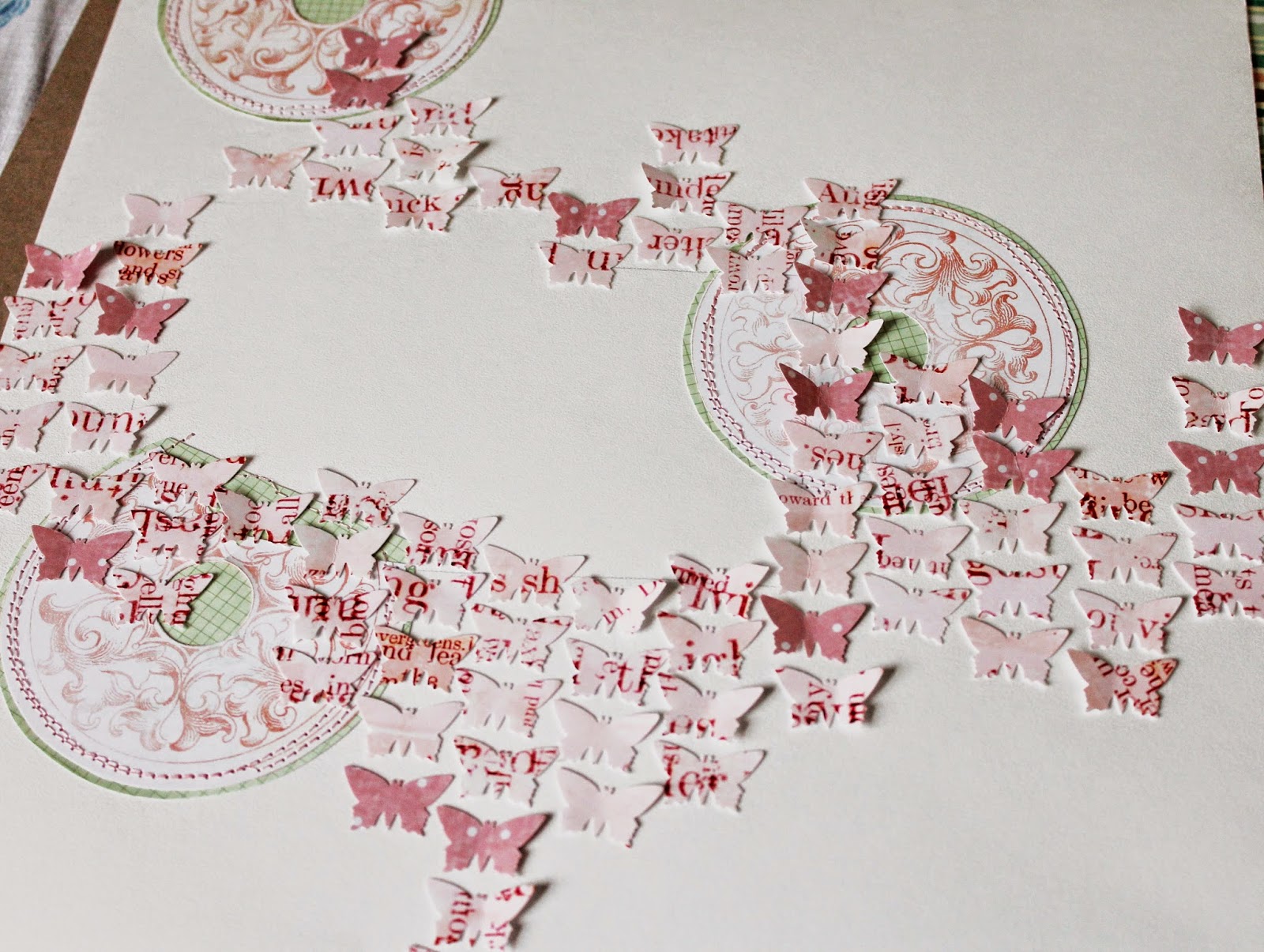 Затем из выбранной бумаги надыроколим фигурки. Т.к. у меня будет страничка про дочку, то я выбрала вот таких милых бабочек.