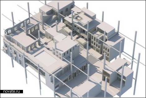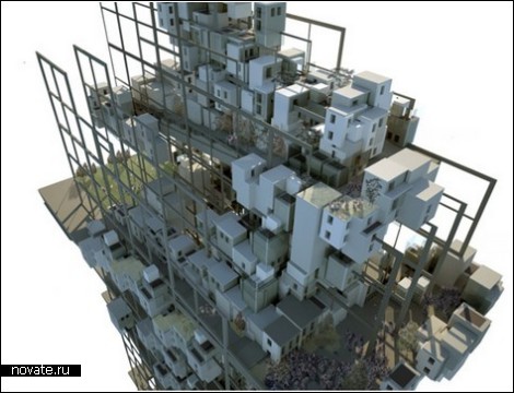 Для начала в этом небоскребе будет построена решетчатая структура со встроенными в нее лифтами, водопроводом, канализацией и электросетью. А уж дальше вся эта структура отдается на милость ее будущим обитателям. Они смогут как заказать типовые дома на любом из этажей, так и индивидуальные проекты. Такой вариант выглядит куда более устойчивым и гармоничным, чем в проекте вертикальной улицы от группы украинских архитекторов.