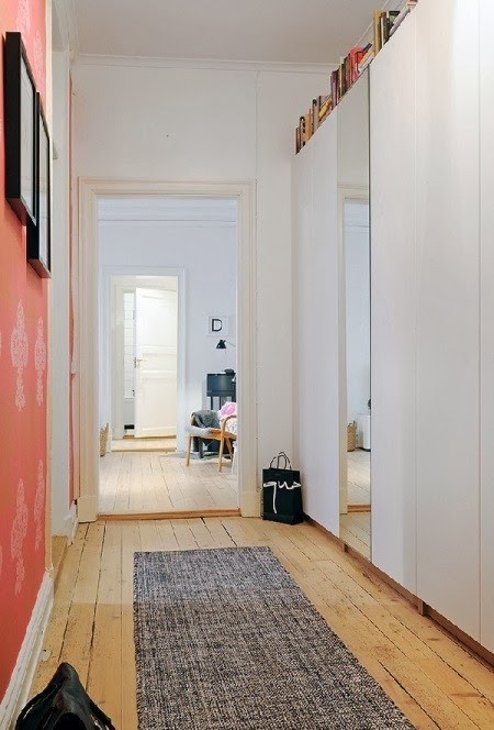 Ну здесь тоже вы не узнаете чего-то принципиально нового. Для маленькой прихожей идеальным вариантом будет светлая цветовая гамма, которая добавит легкости и зрительно увеличит размеры комнаты. Белый цвет отлично подойдет для данных целей, однако он слишком быстро пачкается (особенно при наличии в доме маленьких детей и животных), так что можно остановиться на других цветах с большим содержанием белого. Это может быть голубой, светло-фиолетовый, кофе с молоком, салатовый, бежевый. Еще такой момент, если ваша прихожая узкая и длинная - избегайте продольный полос, так как они еще больше вытягивают и сужают пространство. В данном случае пол и обои светлых оттенков визуально расширят комнату.