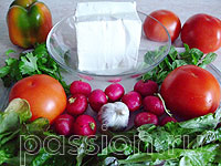 Украсить полосками болгарского перца, "цветами" из редиса и листиками мяты. |