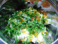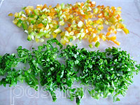 Сельдерей и перец мелко нарезать, оставив несколько полосок перца для украшения. |