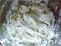 Фету размять, добавить перец, зелень сельдерея и измельченный чеснок. |