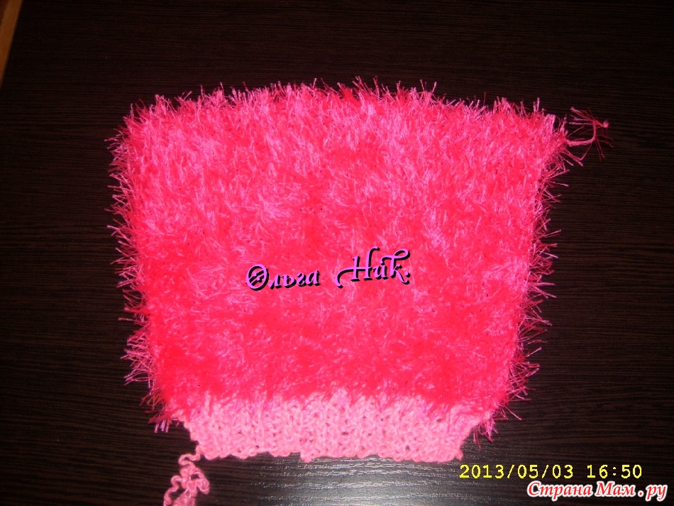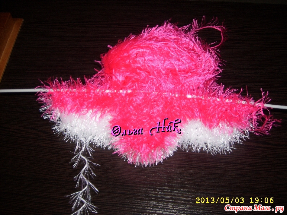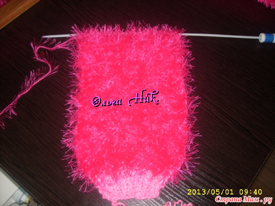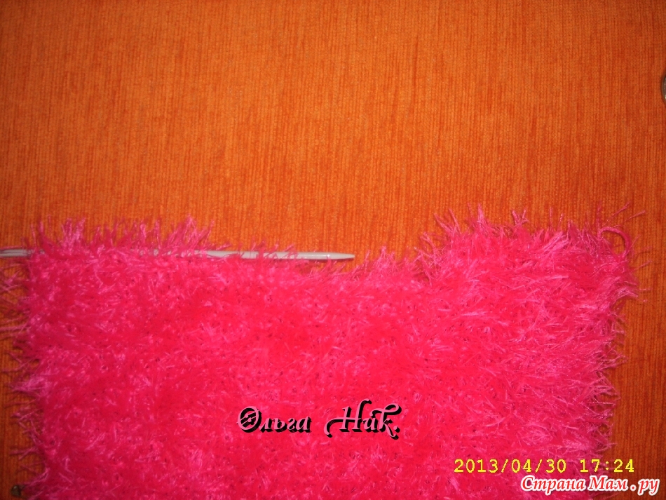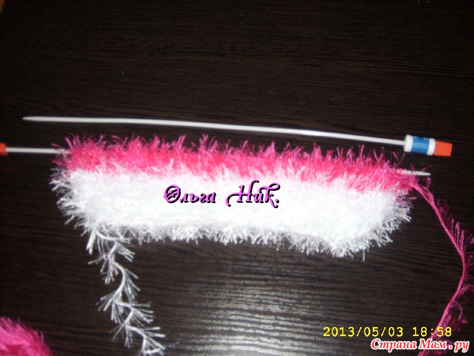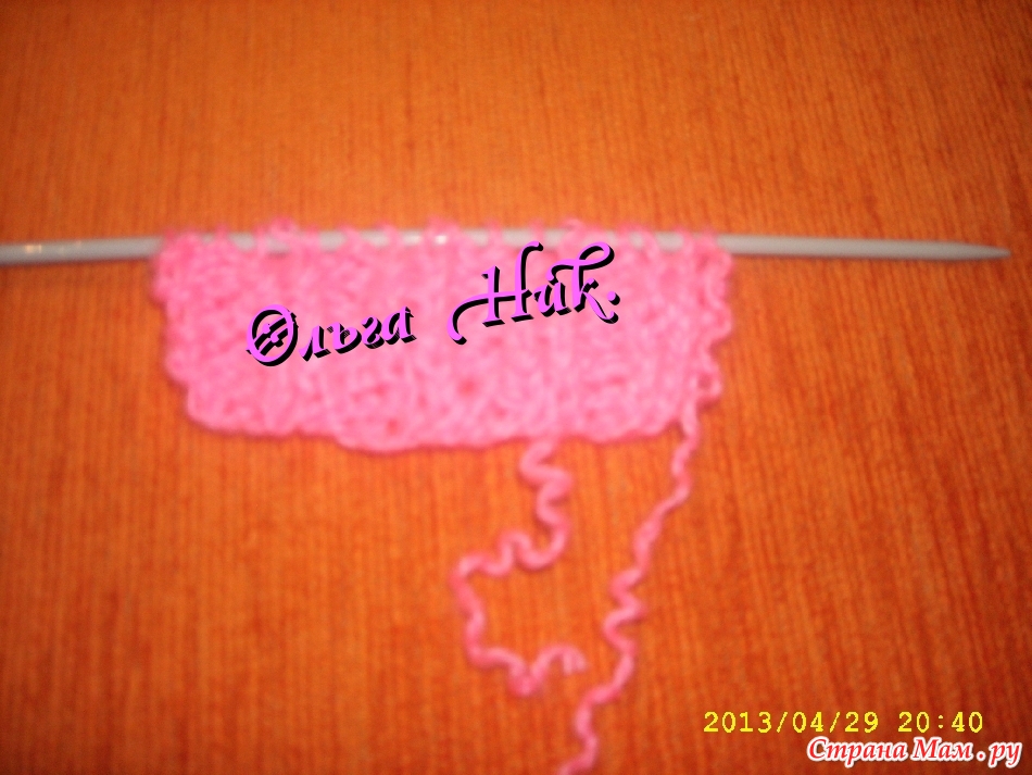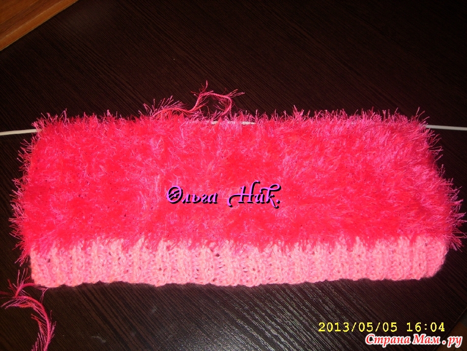 В 12 ряду присоединяем нить "Травка" розового цвета и вяжем 6 рядов платочной вязкой.