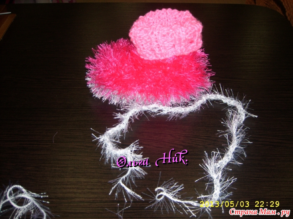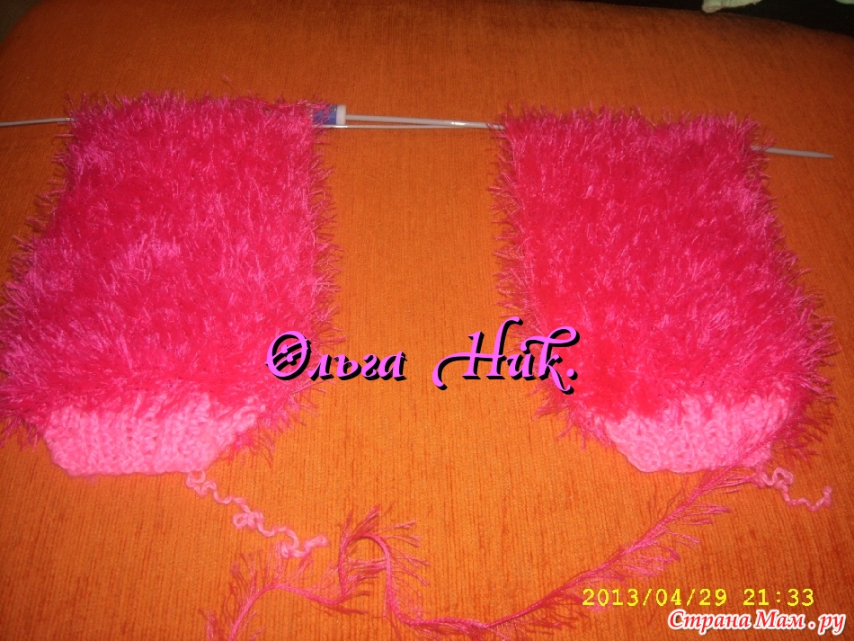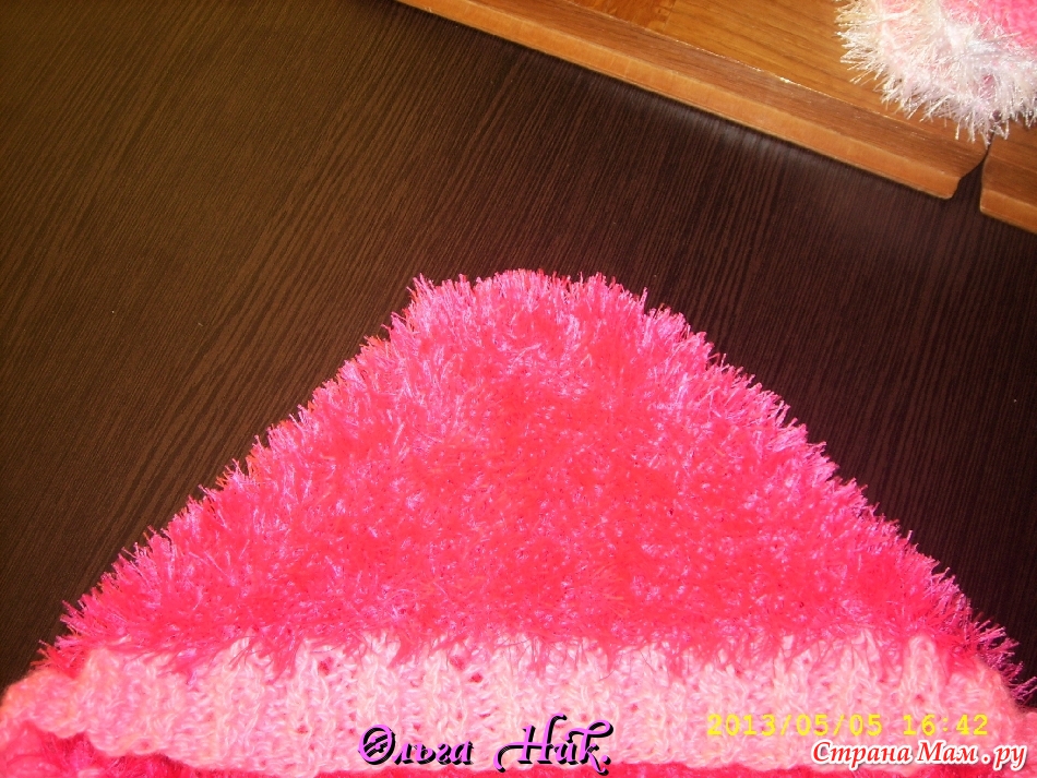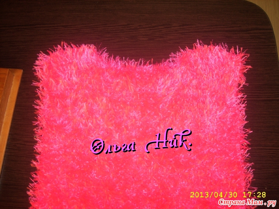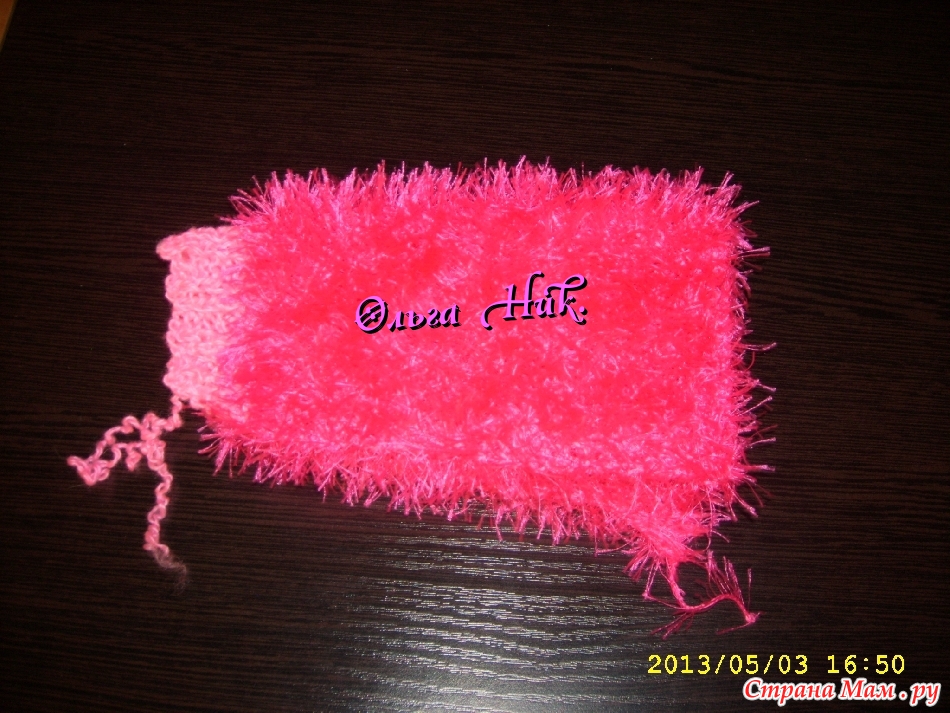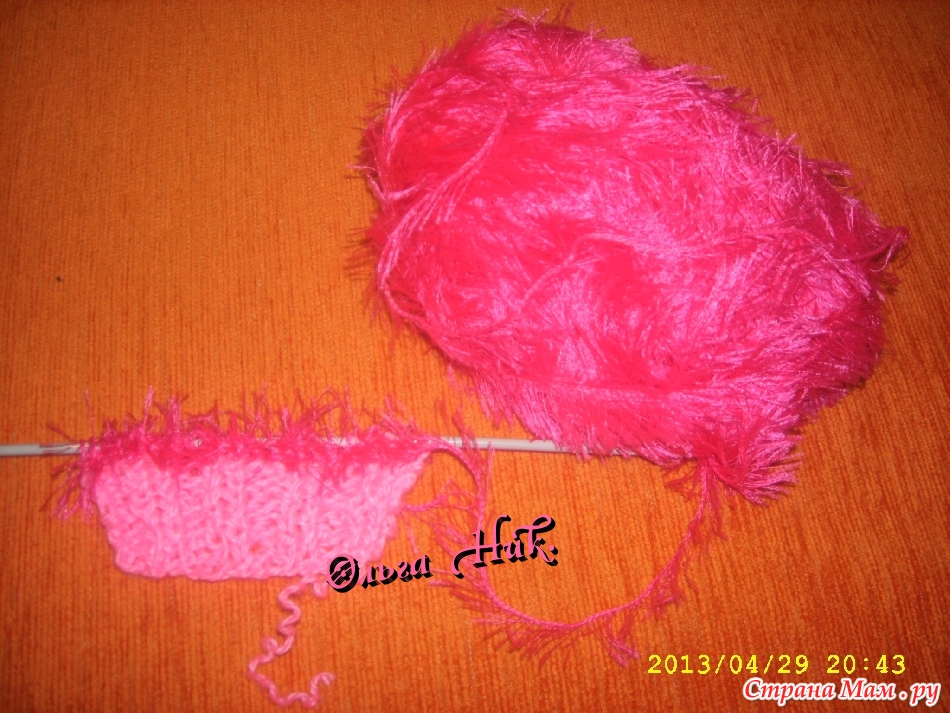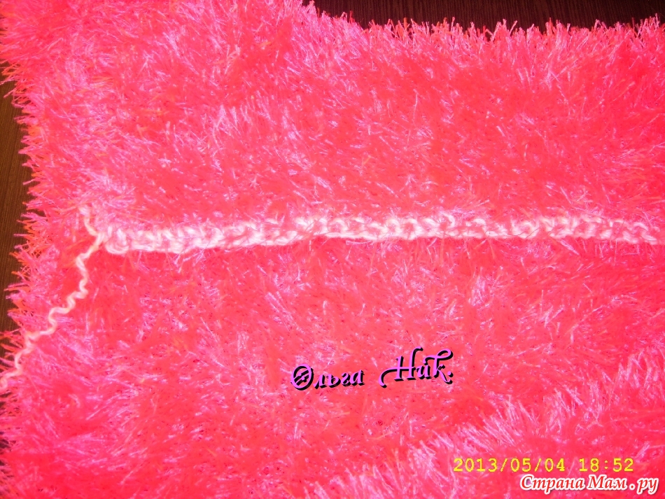 В 12 ряду присоединяем нить "Травка" розового цвета и вяжем 6 рядов платочной вязкой.