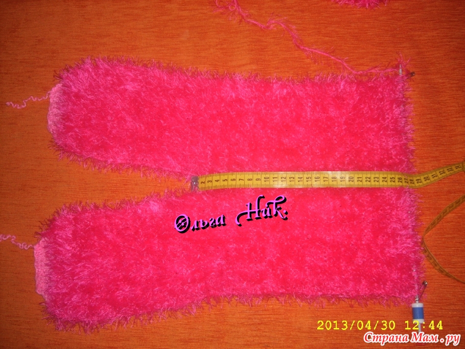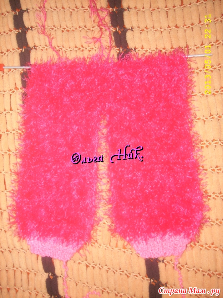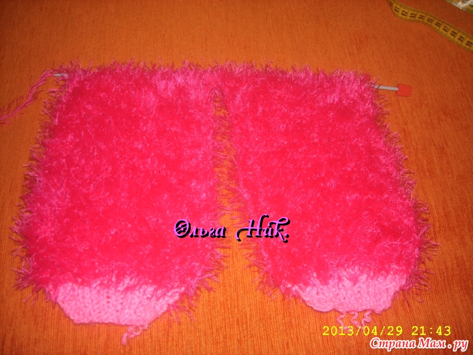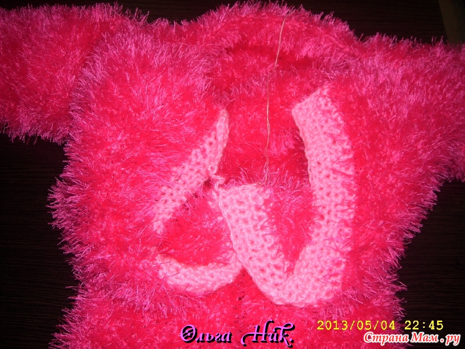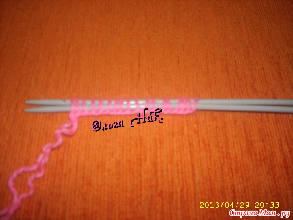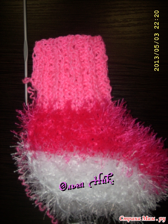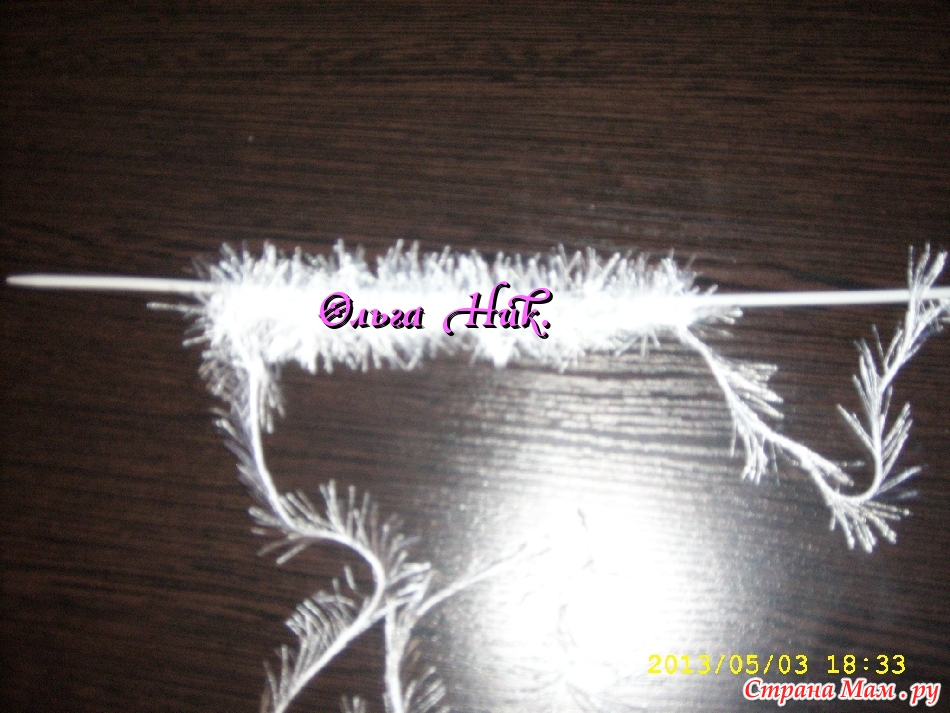 В 12 ряду присоединяем нить "Травка" розового цвета и вяжем 6 рядов платочной вязкой.