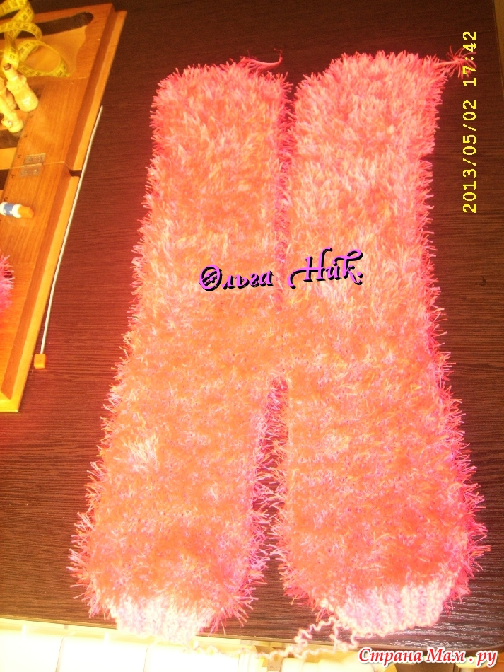 Далее вяжу платочной вязкой до 64 ряда (это 23 см.) Первая штанина готова. Откладываю работу.