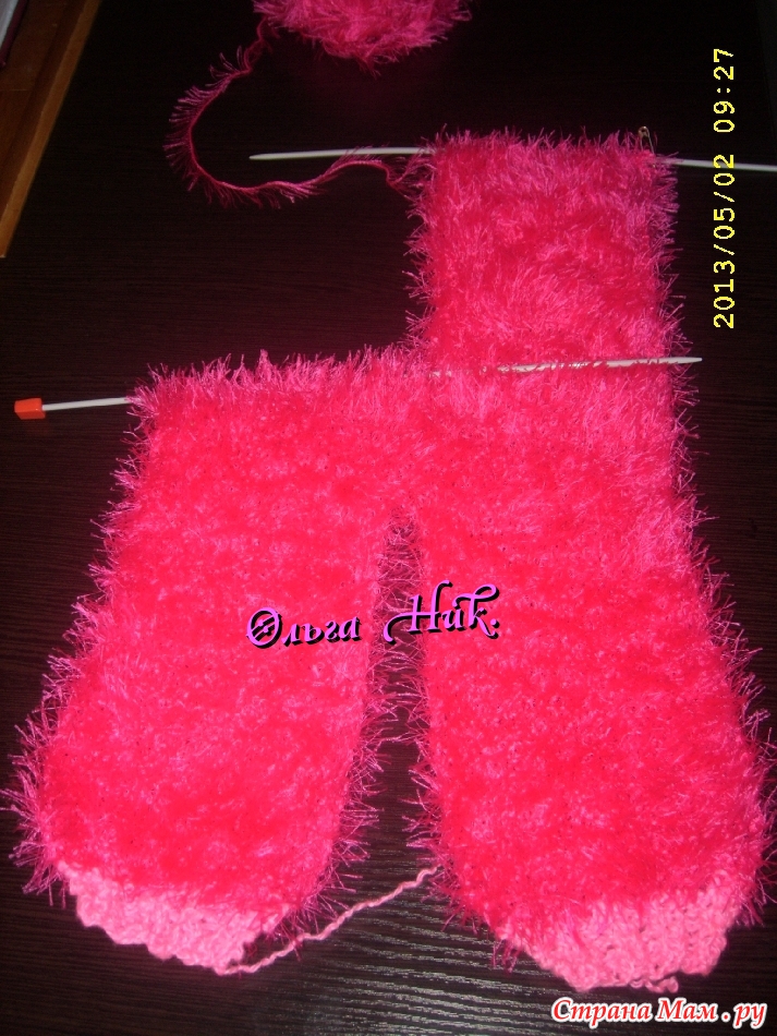далее вяжем один ряд лиц. петлями, а во 2 ряду, равномерно убавим 8 петель, далее вяжем без изменений до 6 ряда, в 7 ряду присоединяем нить "Москвичка" и вяжем резинкой 2*2 - 9 рядов, в 10 ряду, все петли изн.(это для сгиба) и далее еще 9 петель резинкой 2*2, в 10 ряду все петли закрыть. Не выворачивая изделия сшить верхнюю половину манжеты