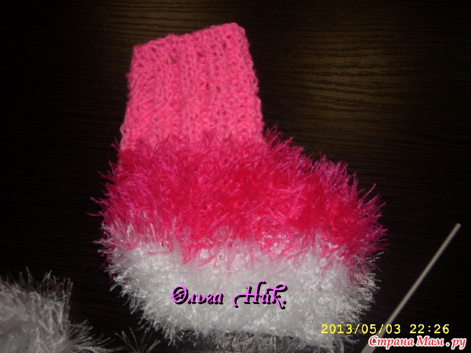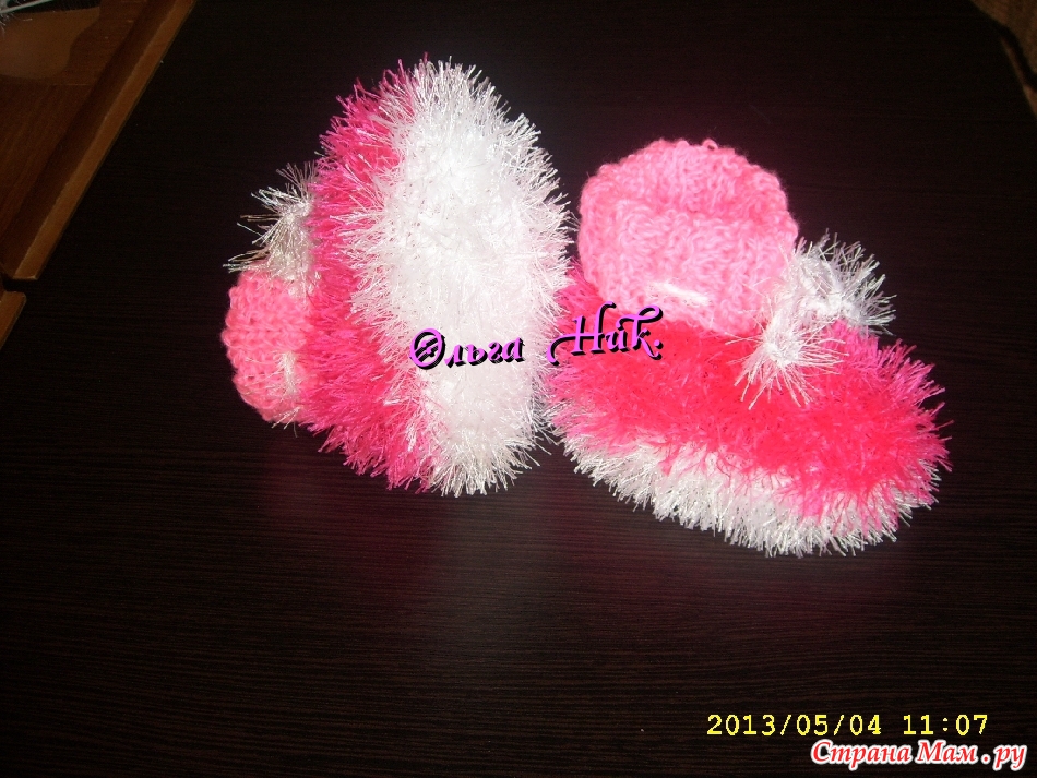 Далее вывернуть пинетку и сшить вторую половину манжеты и все изделие до конца, не забывая менять цвет ниток.