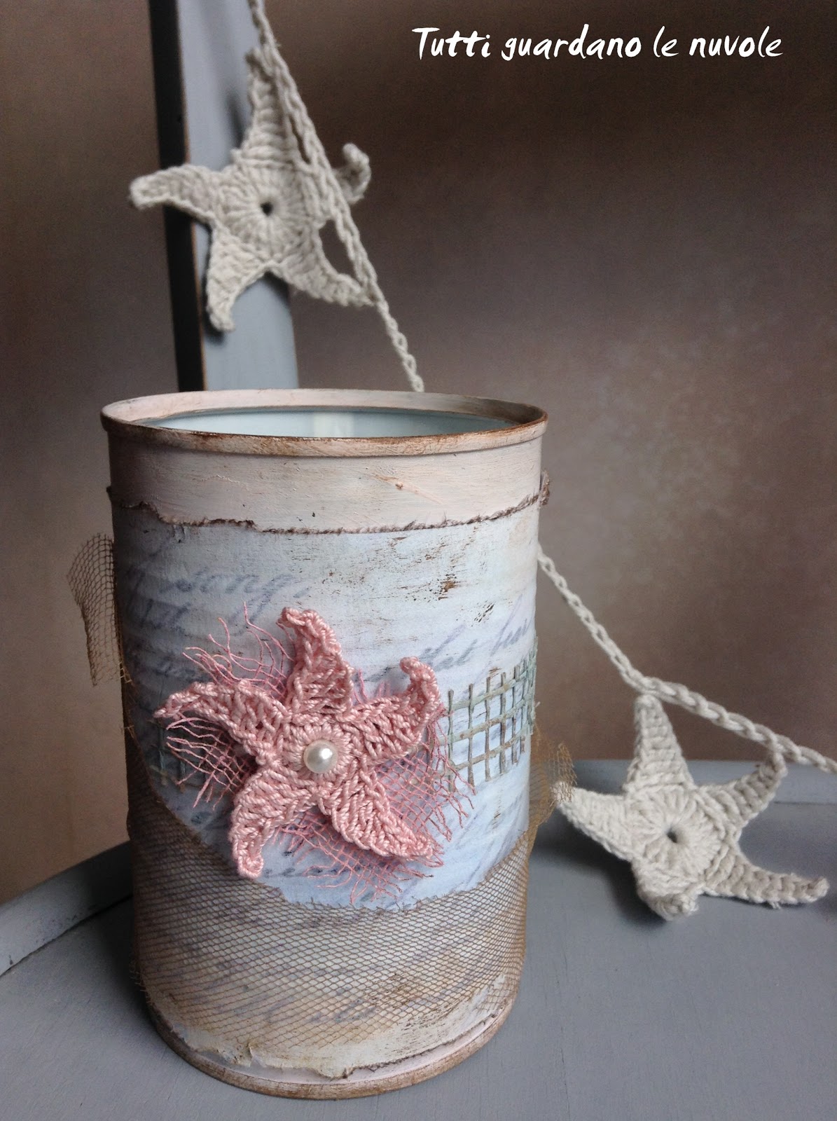 В банке нужно при помощи ручной дрели сделать пару отверстий (или же шилом), прикрепить ручку, изготовленную из проволоки. Теперь банку можно украсить по собственному вкусу.