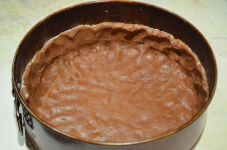 5. Разъемную форму на 22 см смазать сливочным маслом и руками по нему распределить тесто, сформировать бортики около 4 см высотой, наколоть вилкой и убрать в холодильник на 20 минут, затем испечь корж примерно 20 минут при 200 гр.