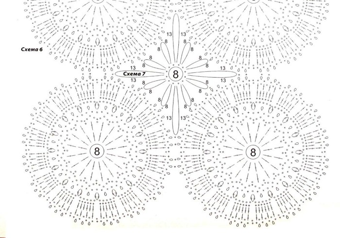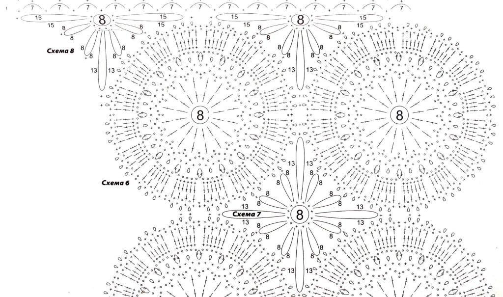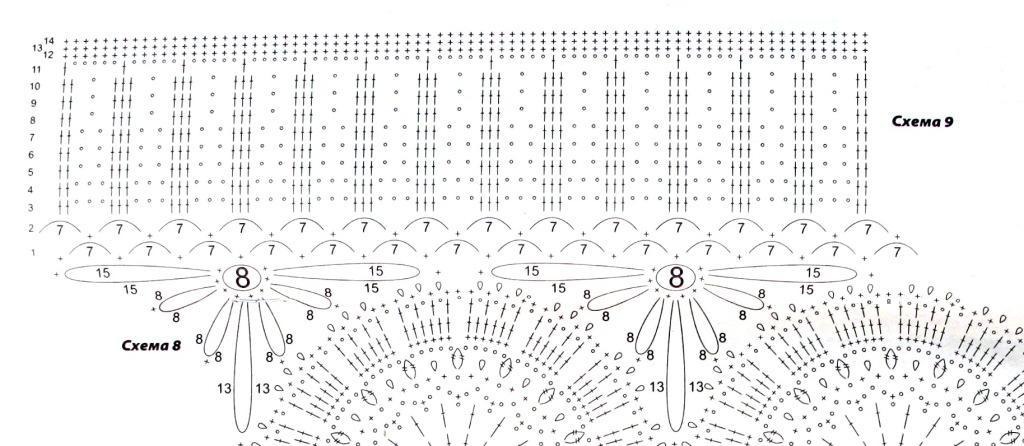 Крючком свяжите 24 мотива по схеме6, затем 16 мотивов по схеме7 и 16 мотивов по схеме8, соединяя их между собой в процессе вязания последнего ряда согласно выкройке и схемам. По верху юбки для кокетки свяжите по кругу 14 рядов узором по схеме9. По низу юбки свяжите 18 рядов узором по схеме10 и закончите работу.