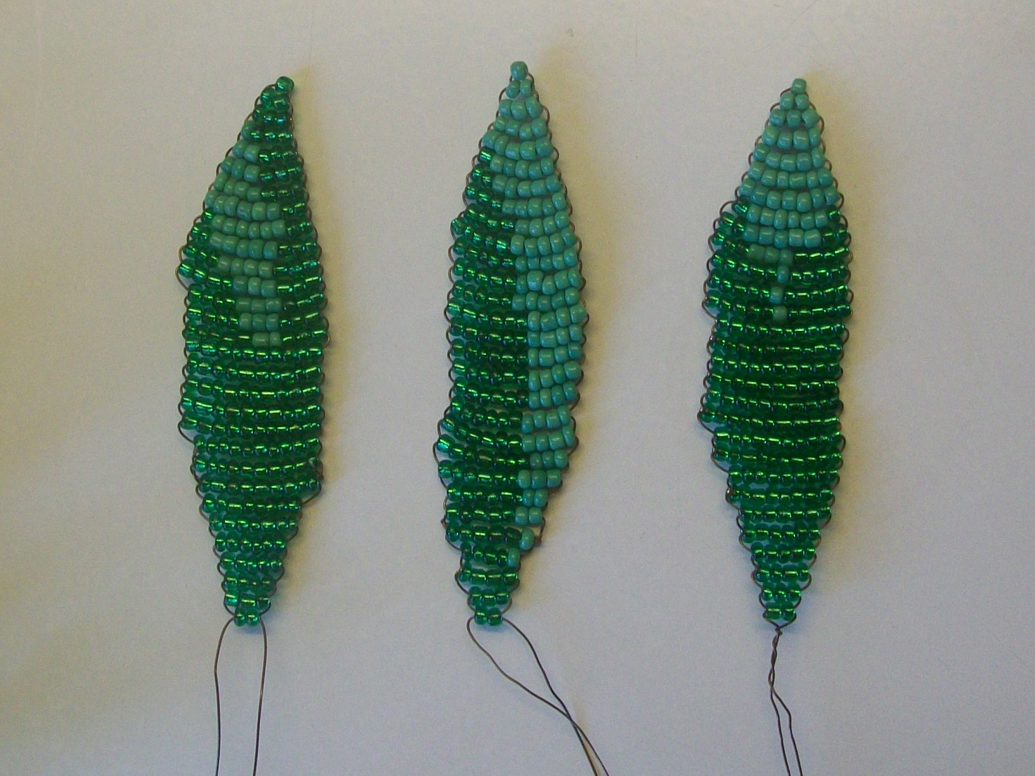 Таких листьев надо сделать минимум 3 штуки, причём их можно сделать как из одного оттенка зелёного бисера, так и из разных оттенков, чередуя тёмно-зелёные и светло-зелёные бисеринки в произвольном порядке.