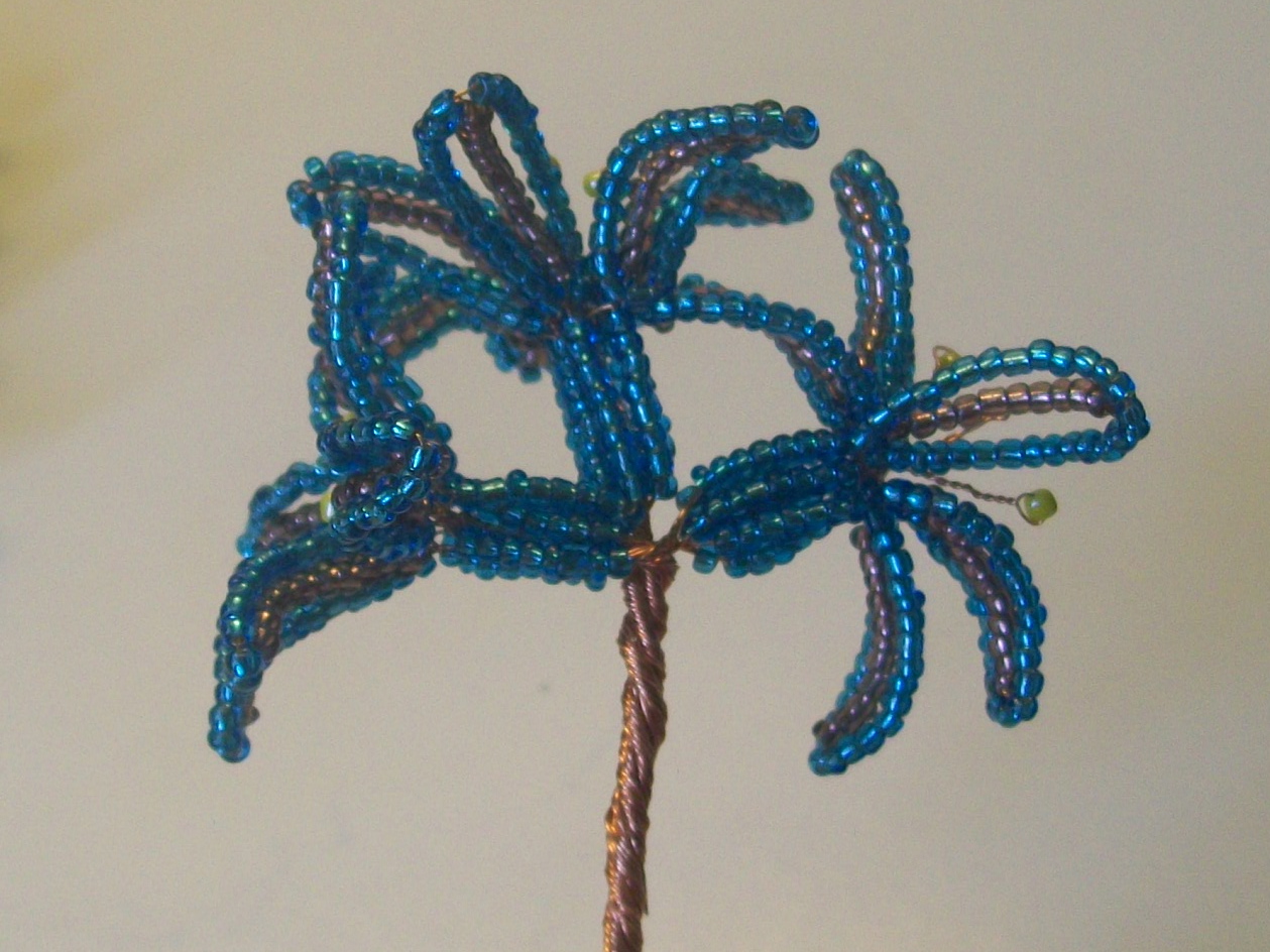 Сначала делаем лепестки цветков. Для каждого лепестка берём проволоку длиной 40 см. Набираем на проволоку 28 синих бисеринок и размещаем их на середине проволоки.