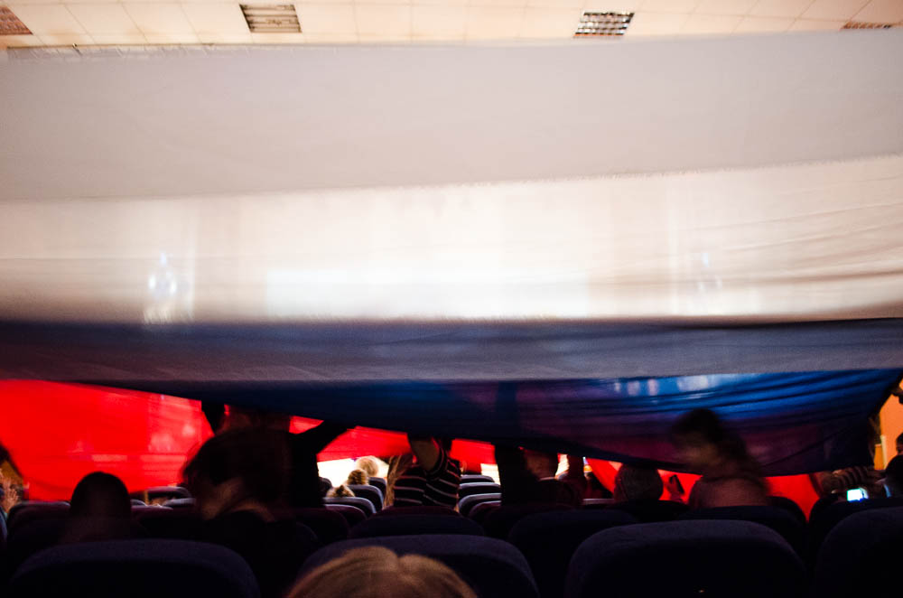 На весь зал растянули полотна нашего флага.