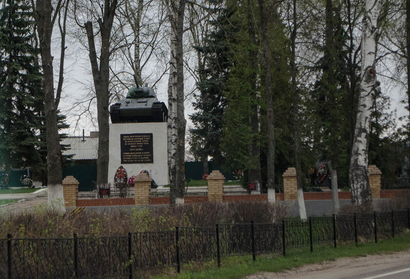 Сейчас здесь мемориал, а до этого, как рассказывают старожилы, была деревянная церковь. Фашисты согнали туда народ и сожгли вместе с церковью.